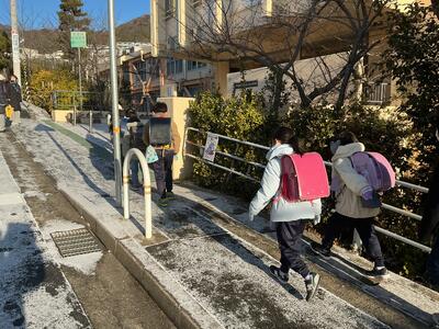 雪道を子どもたちが登って来ました。