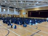 1〜5年生は最後の給食でした。1時30分ごろ下校のため1年生がホールに集合。