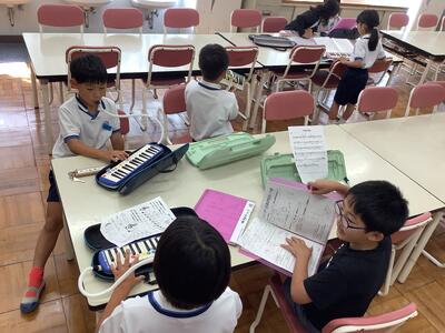 3年生の「村祭り幻想曲」の練習風景。楽器ごとに部屋を分けてやるため、子どもだけの時間も増えますが、この時間をどう練習するかが音楽会の成功の鍵(英語ではrecipe for success)です。
