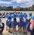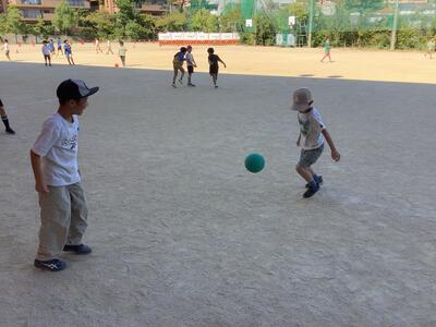 運動場に工事の囲い(写真奥)ができたり、車が駐車したりするので、先生たちも心配して休み時間など、時々見ていますが、このとおり、ルールを守ってのびのびと遊んでいます。