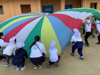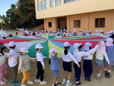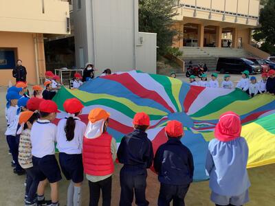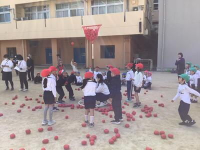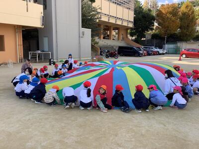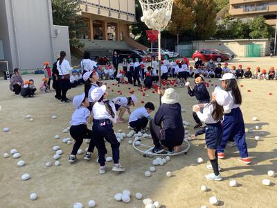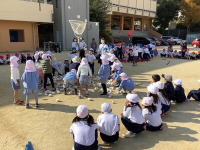 元気に朝日ケ丘小学校の運動場に集まったのは、岩園幼稚園、あいさいこども園、芦屋大学附属幼稚園の幼児と本校の1年生です。