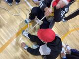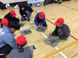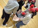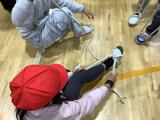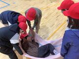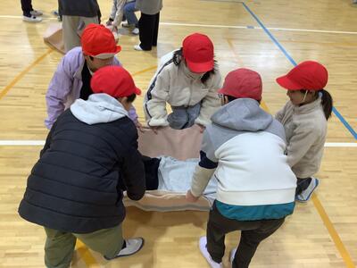 毛布で負傷者を運ぶ練習です。