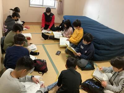予定を確認し班の人に伝えます。帰校式の役割分担も。