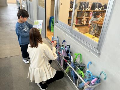 雨でした。傘たてにきれいに傘を置いています。