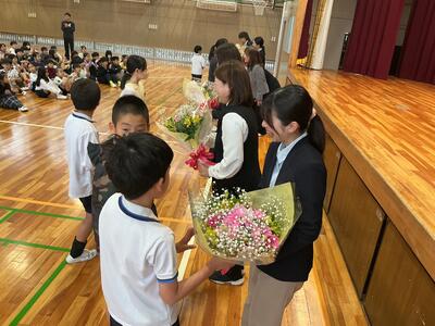 子どもの代表が先生たちとの思い出を話し、エールを送りました。