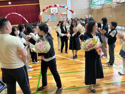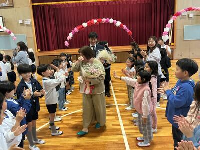 アーチを作り見送りました。涙ながらに去る先生たち。