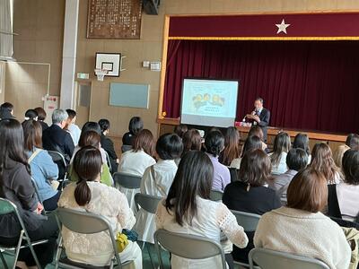 始業式からの子どもたちの様子を映像で紹介した後、校長より本校のめざすもの、そしていじめの防止